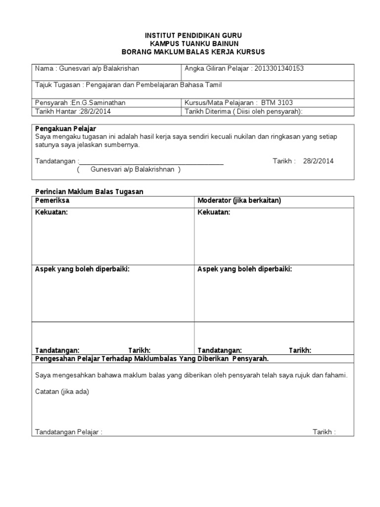Borang Maklum Balas Kerja Kursus