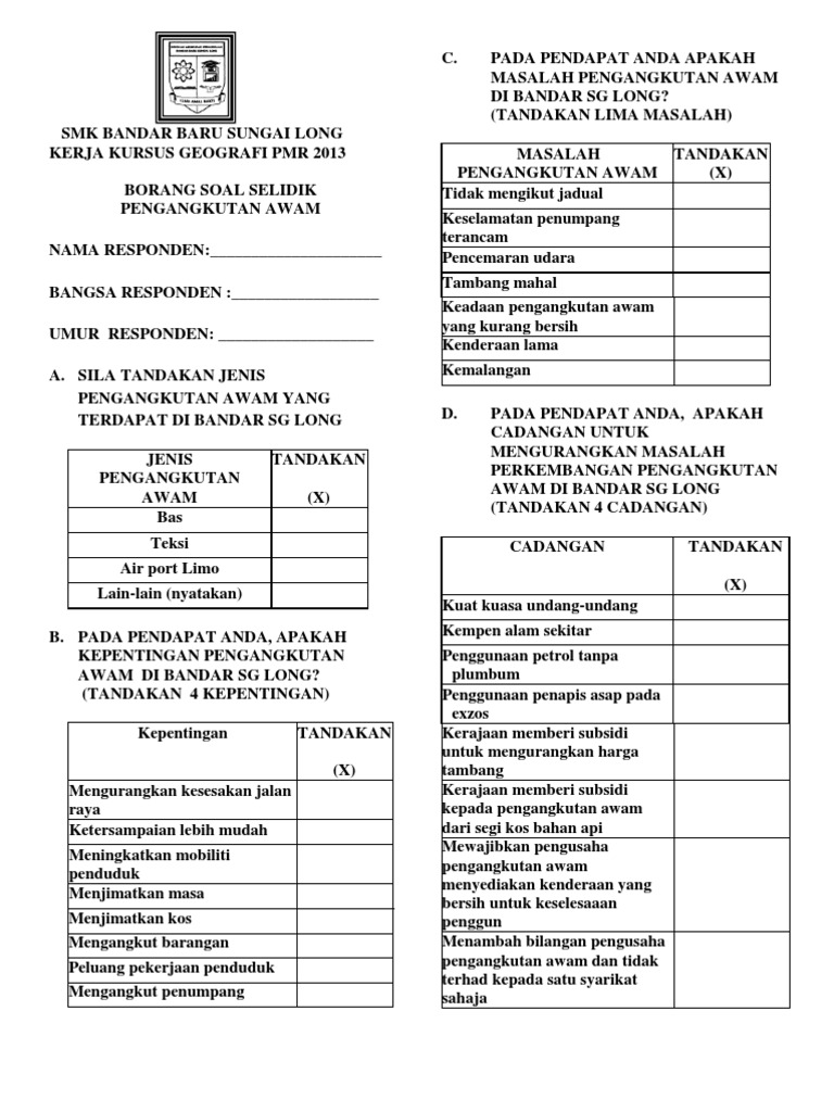 Contoh Borang Soal Selidik Geografi Pengangkutan Awam