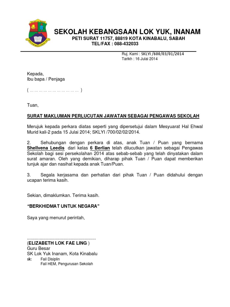 Contoh surat rasmi perletakan jawatan sebagai pengawas.