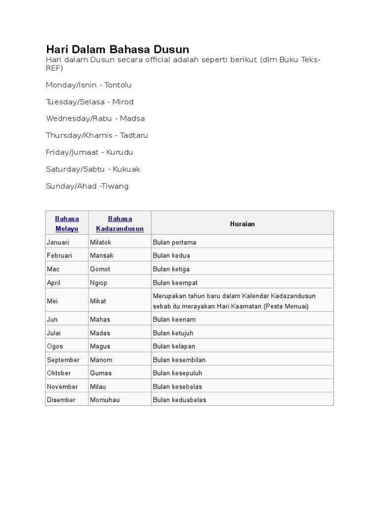 Hari Dalam Bahasa Dusun