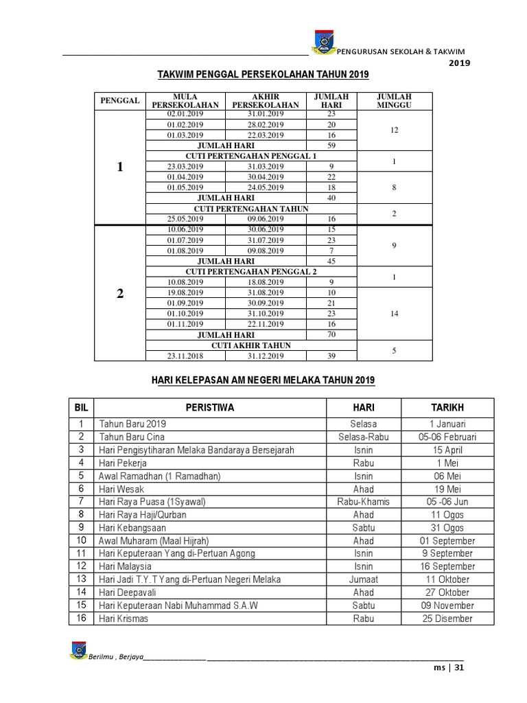 Takwim Persekolahan Dan Cuti 2019