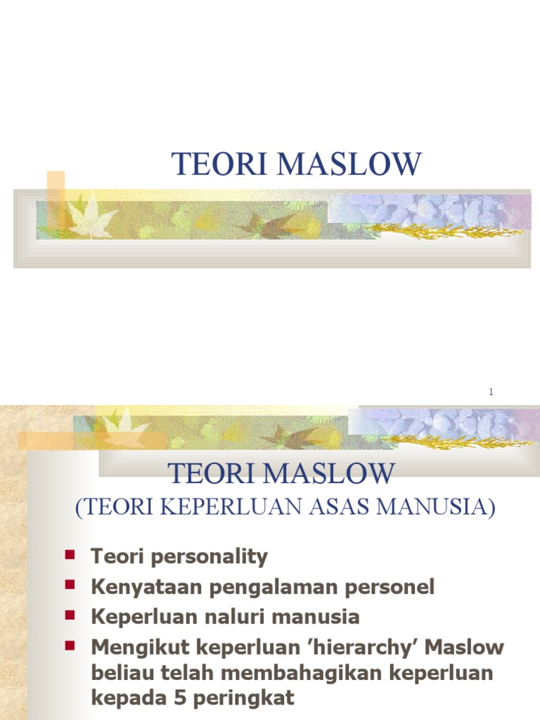 Background info mengenai teori kebutuhan maslow teori maslow merupakan pembahasan cabang dari bagian teori organisasi dan teori kepemimpinan. Ini pengaruh luas karena sebagian tingginya tingkat kepraktisan s teori maslow. Teori hierarki keperluan maslow masih lagi digunapakai secara meluas dalam pengurusan organisasi moden masa kini kerana minat yang sentiasa berterusan dalam kalangan penyelidik dalam kerja kerja penyelidikan maslow dye et al. Teori maslow mengemukakan lima tahap keperluan yang perlu dipenuhi oleh manusia untuk mencapai kesempurnaan hidup.